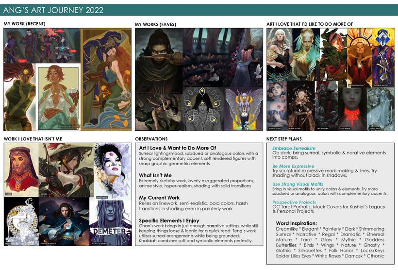This section was fun, as it tasked me to identify more specifically what kinds of elements I could use in my work. Do I like certain symbolic objects? Does anything repeat in my work that I want to do more of? What themes and aesthetics do I want to show in my work?