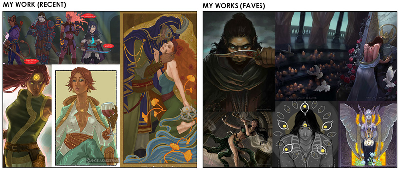 My Faves rely on semi-realistic rendering, bold colors, & harsh transitions in shading. My Faves also look more like the work I want to do than my Recent Work, which relies on line art & stylization, though there are hints of my style being in transition with my more painterly pieces.