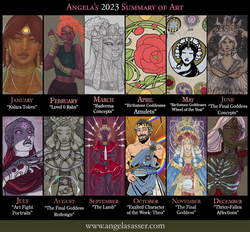 It was honestly a rough one! From my existential dread dealing with generative AI replacing Illustrators to a significant cancer scare that derailed all my best laid plans, I’ve come out the other side with the best outcome of a benign tumor. In spite of the dark cloud of looming disasters, I managed to complete my Birthstone Goddesses collection after 6 years of toil! It may not have gotten the big finish I wanted for that project, but I’m happy to free up my muse and attention for other exciting endeavors on the horizon.