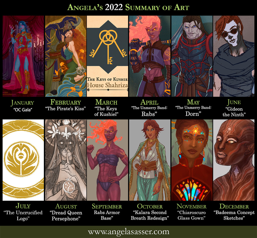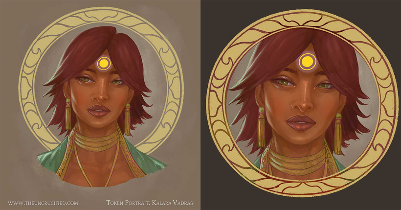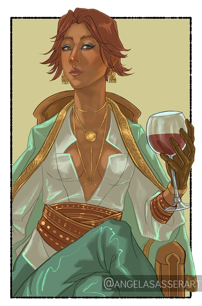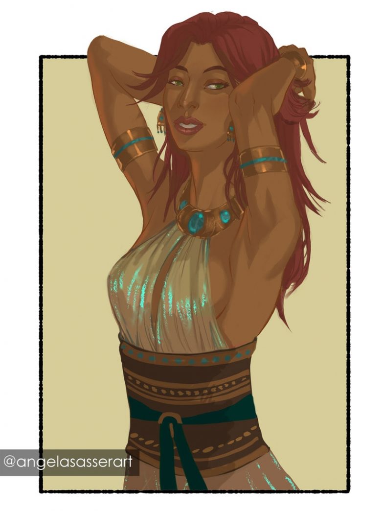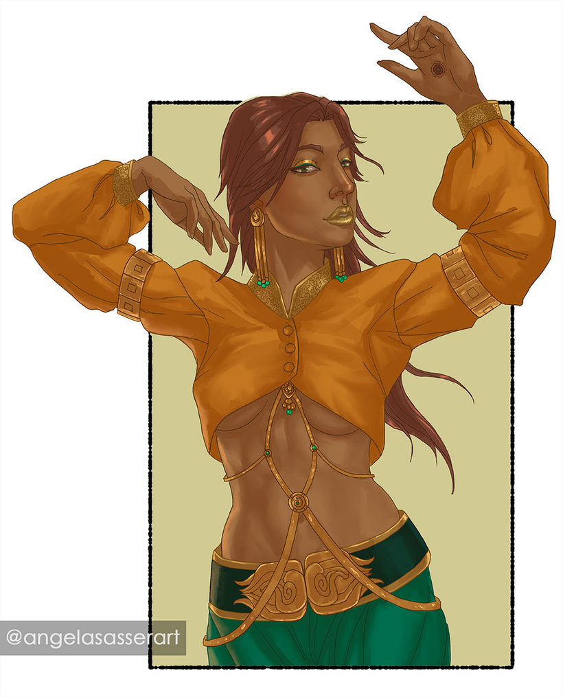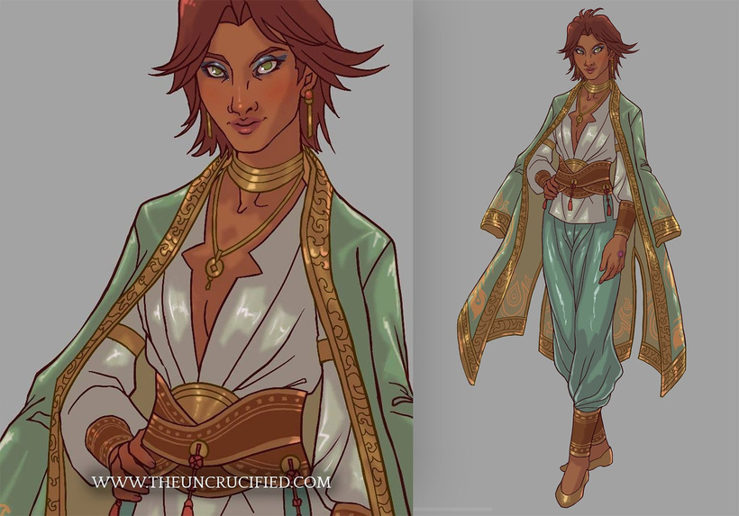 For those who are new to Kalara, she’s my Exalted tabletop rpg character, a smooth-talking diplomat and merchant who rose up from the slums of a desert town. She was chosen by the sun god to bring nations together with her words, but she chooses her own path of revenge, first. If that sounds up your alley, you can see more of her over at www.theuncrucified.com.