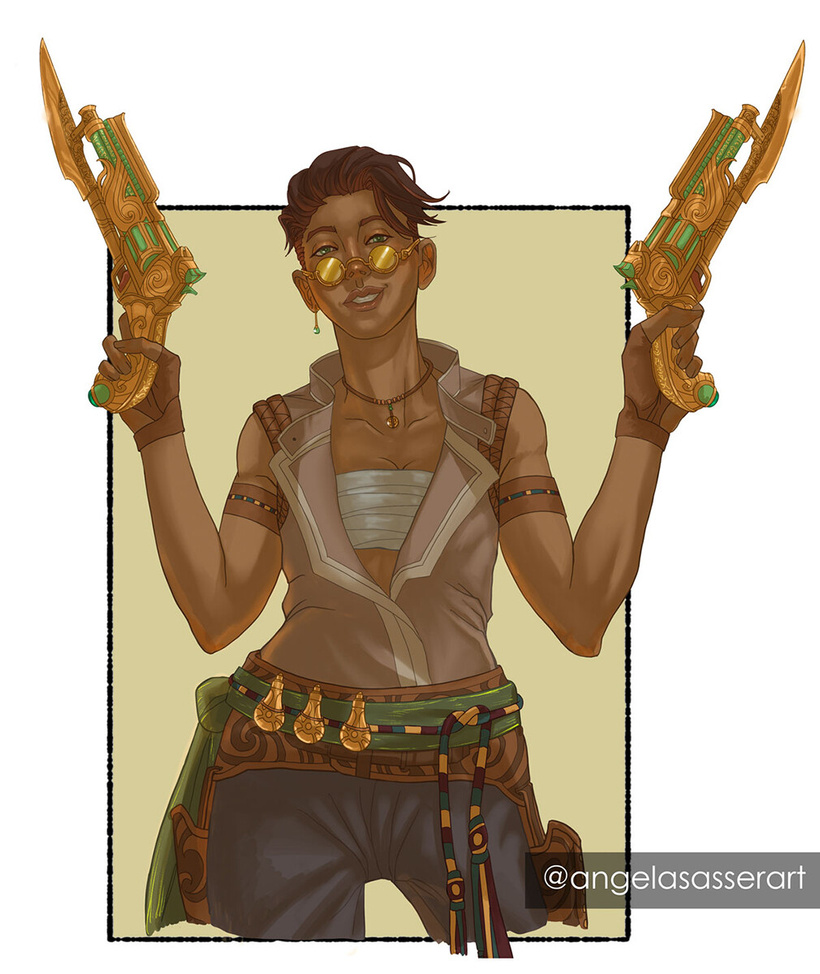 I spent a lot of time on the Prayer Piece guns in this one, as they’re the high level guns Kalara spent a lot of time with in our campaign and I have somehow never drawn them before now! So it felt really good to finally solidify a look for these weapons. These jade and orichalcum weapons contain miniature shrines to small gods that speed the gold prayer inscribed bullets to their targets.