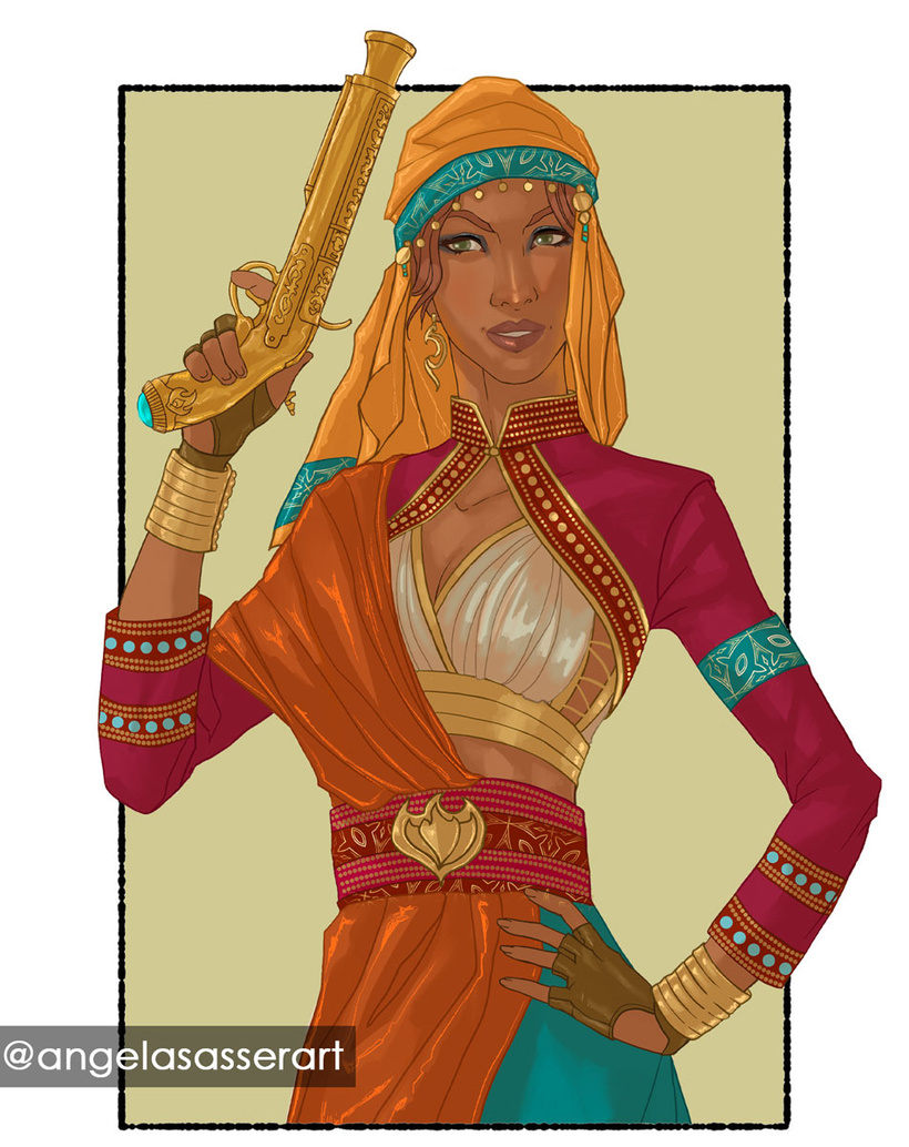 I call this third outfit Kalara’s “Merchant Queen” look. I had more trouble with this pose, which you can see in the time lapse where I drew two alternate ideas. In the end, I went with a different pose so I wouldn’t have too similar of a facial angle to the other poses and a concept that had a more comfortable wrist angle for the gun she’s wielding in this entry.