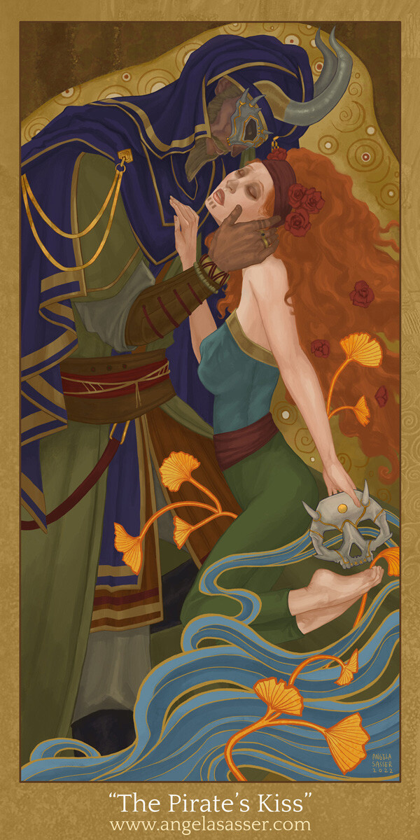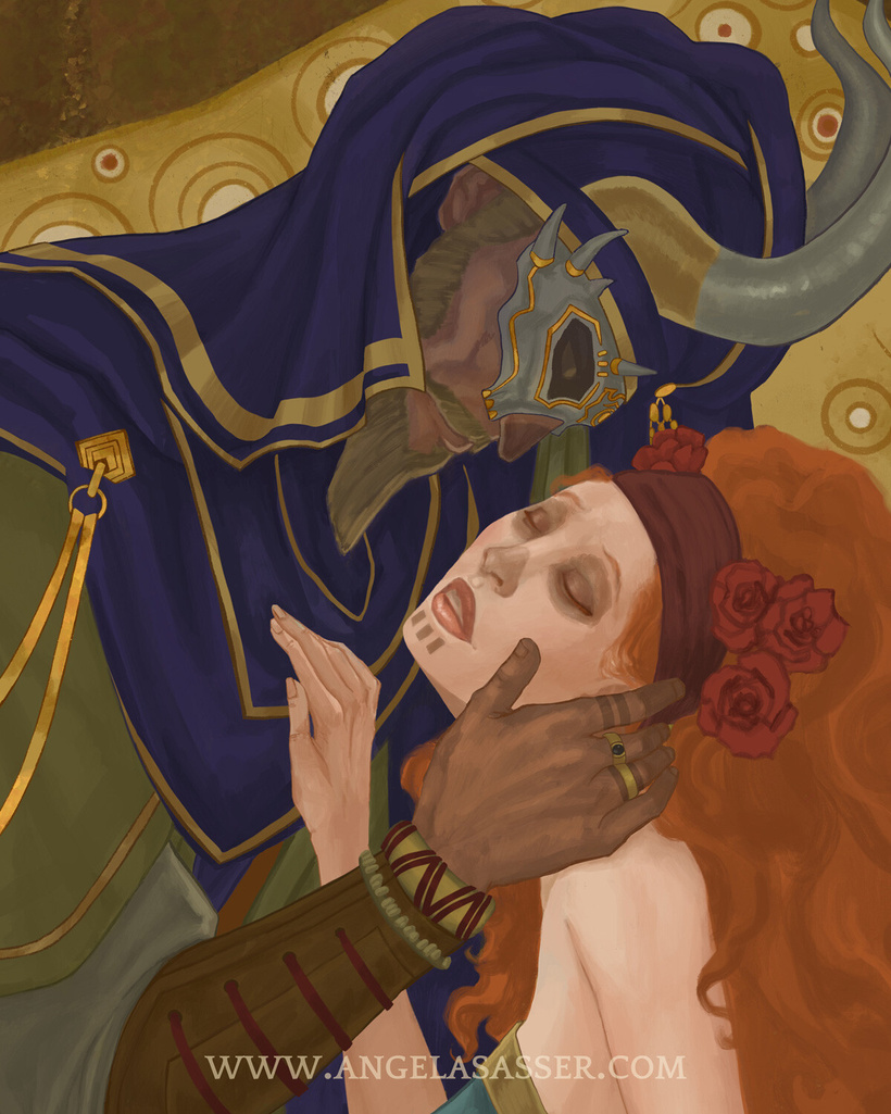 Inspired by Klimt’s The Kiss, which always struck me as being about a woman swept up in a dangerous romance, which was the perfect root inspiration for these characters.