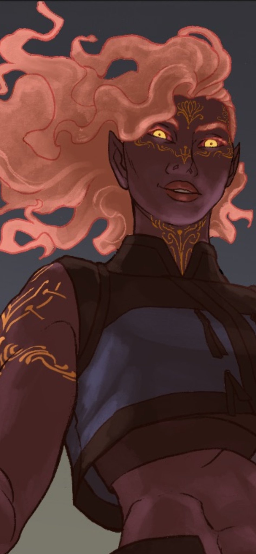 Backstory: Once a princess of the Fire Genasi sultanate, Rabanne (aka Rabs), gave up her title to pursue her own destiny away from the mechanations of the palace where she never felt suited for the title or the responsibilities as one called to be a Storm Herald.