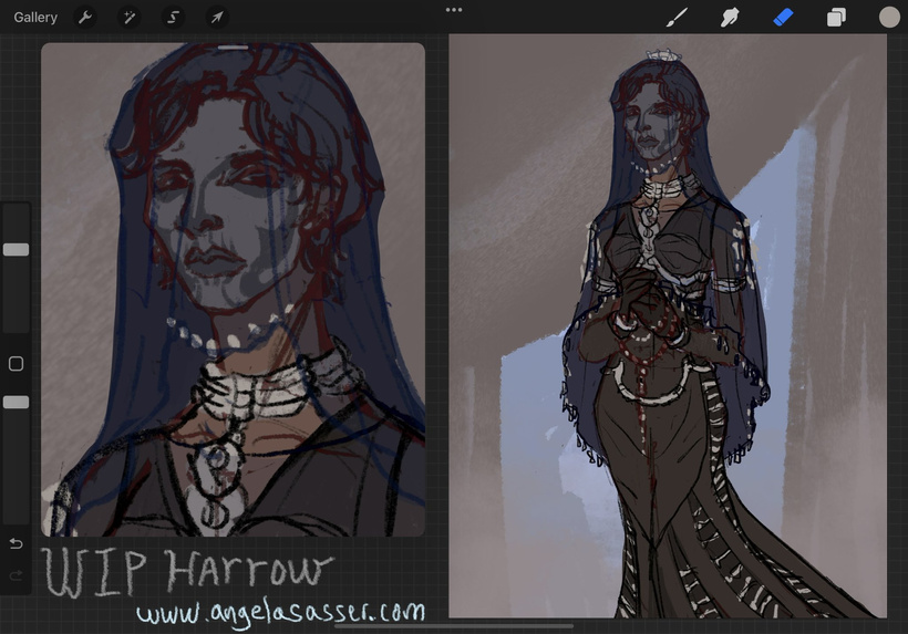 I chose to draw Harrow as she appears in full Ninth House pomp in Gideon the Ninth.  Her goth skelly aesthetic really appeals to my sensibilities!