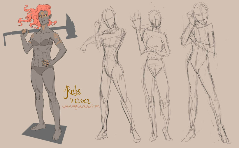 Rabs has been bulked up a bit for this image, as I wanted to accentuate her tall and imposing figure more than her initial rendering.  The pose on the left is going to be the base ‘paper doll’ pose I’ll be repeating for Levels 1 – 8, while the gesture sketches on the right represent an exploration of her younger level 0 self where she was training in secret as a gangly teen in the harem.