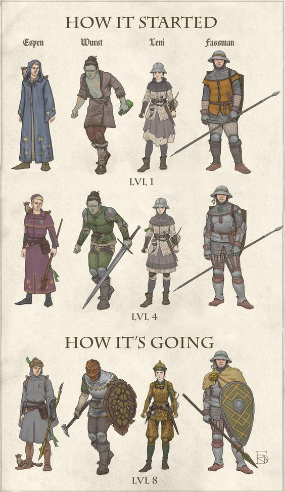 Ever since The Unmerry Band‘s adventures in the Black Pits wrapped up, I’ve been meaning to mine our campaign for practice, starting with a level progression chart of all our characters showing how their armor and wardrobe evolved over time.  This will feature our characters from their wee fragile Level 0 forms all the way up to Level 8 where our story ended (for now).