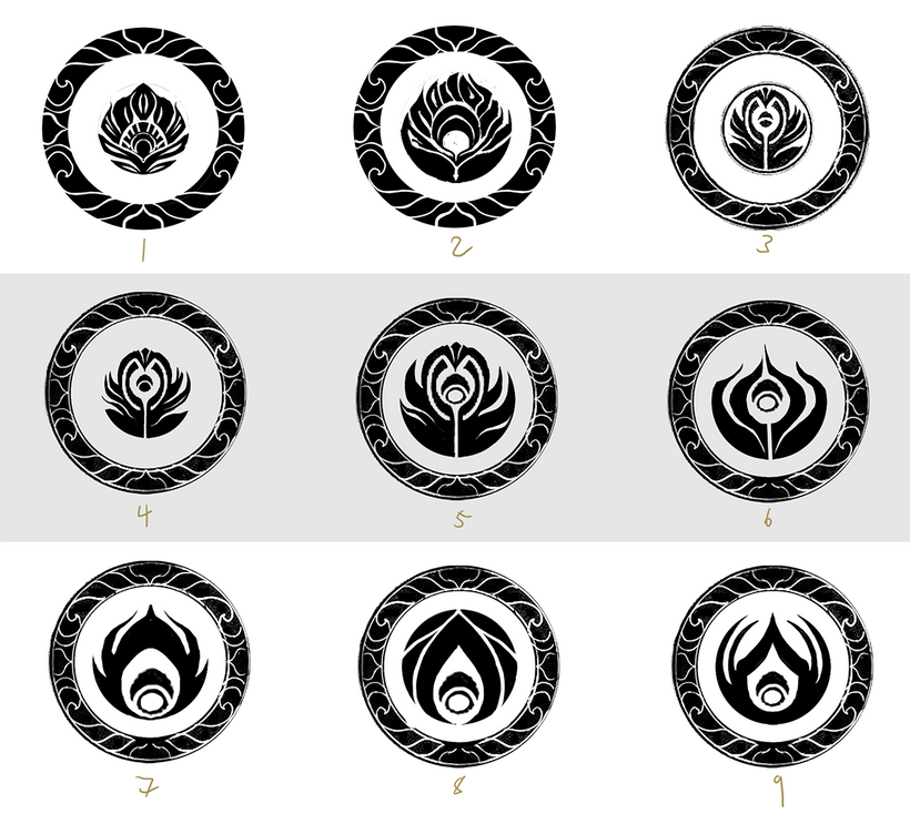 For now, enjoy the many iterations I made as I attempted to channel Kalara’s themes of the Eclipse Caste mark (the glowing symbol that represents her magical abilities), the phoenix feather which represents her resilience, and the flame which represents her cultural identity and rebellious personality.