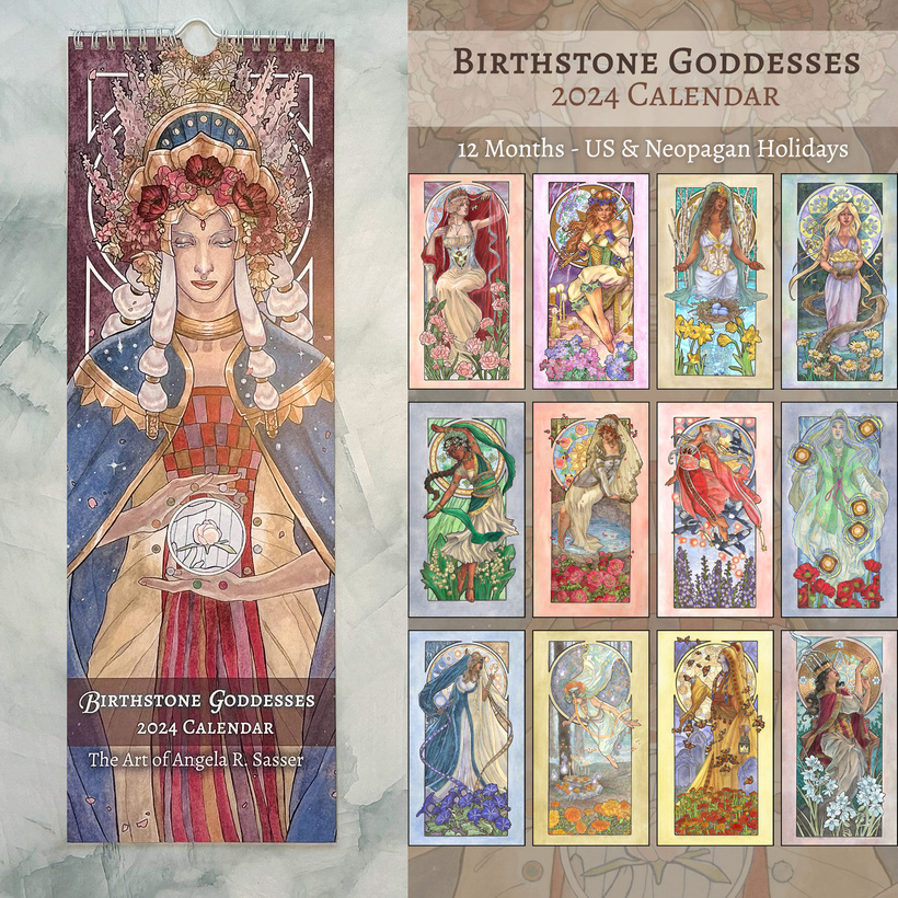 It’s the end of an era for me with the Birthstone Goddesses wrapping up!  I thought it only proper to send the project off with a look back at how it evolved over the years I spent on it.  This journey started as a simple set of 12 paintings for a calendar and ended up being so much more!