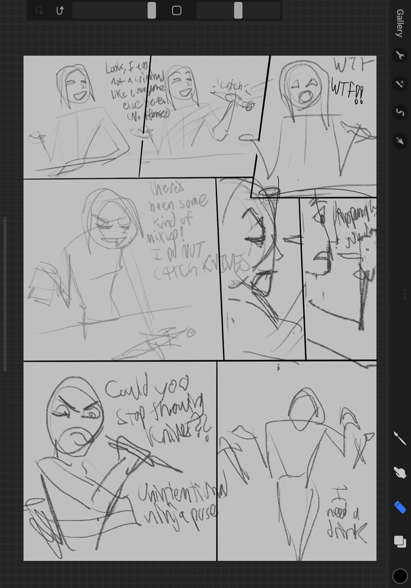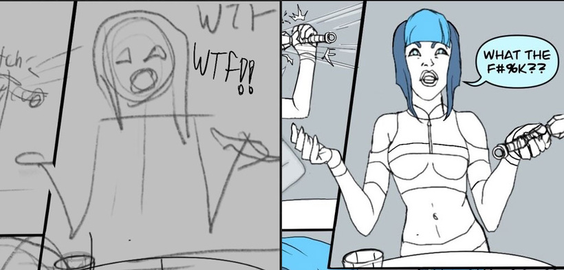 I had a good laugh making expressions into my camera trying to nail down Gale’s various shocked expressions in this comic and how silly, yet accurate the rough drawings of her face were to the emotions she was expressing.