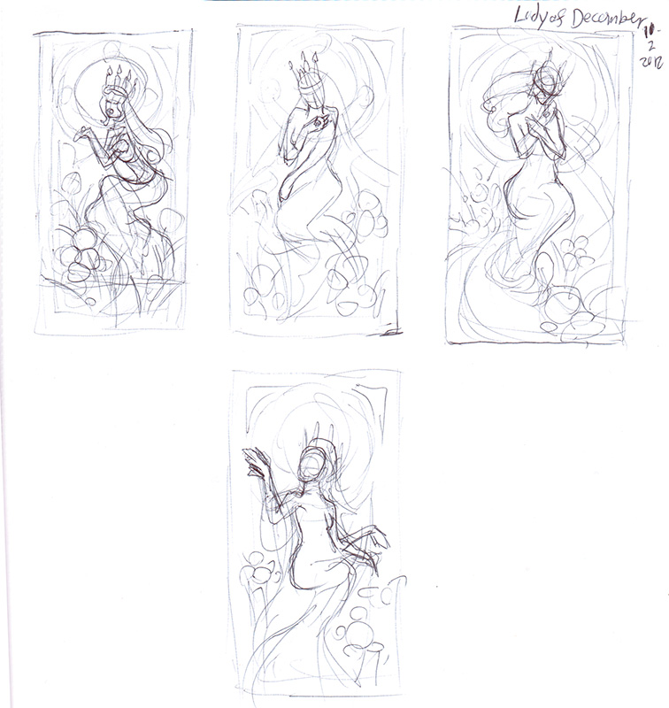 I always start with one of these as a ‘getting to know you‘ exercise. Typically done without reference so that I can channel the mental image without any visual biases. Also done in pen so I won’t obsess too much about making the doodle too detailed. This is where I rough out basic ideas for compositions.