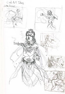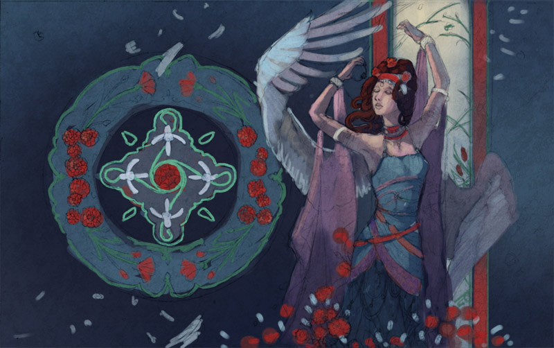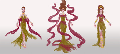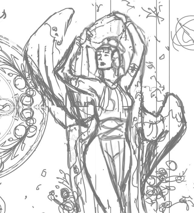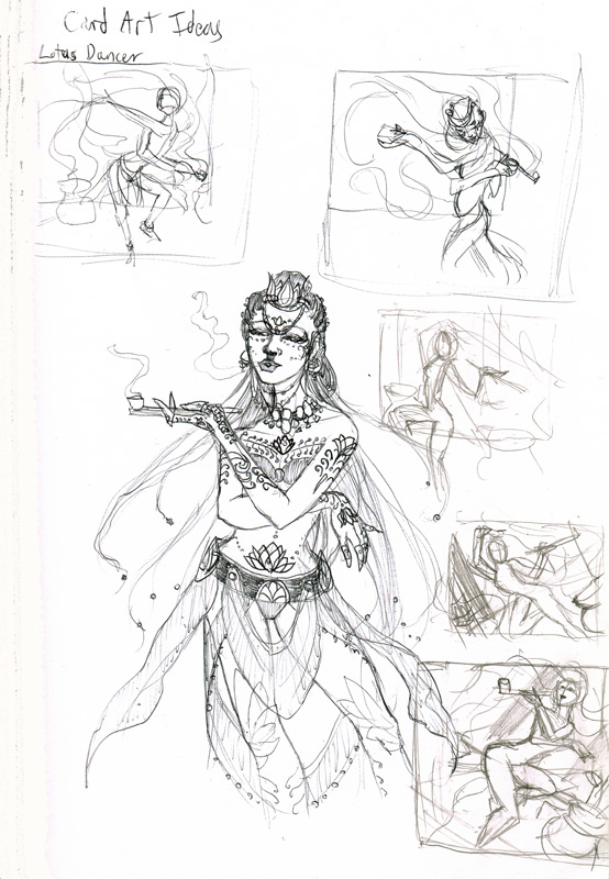 I also gather references from my own stock art poses and all over the net, baring in mind that lotuses have been translated into many visual forms, from more naturalistic to the abstract lotuses we see in Egyptian art. A big challenge will be to make her setting read as a fantasy setting and not too heavily inspired by one culture or another. These references will all play a big part of the detail in her costume and decor of the background hall she’s dancing in.