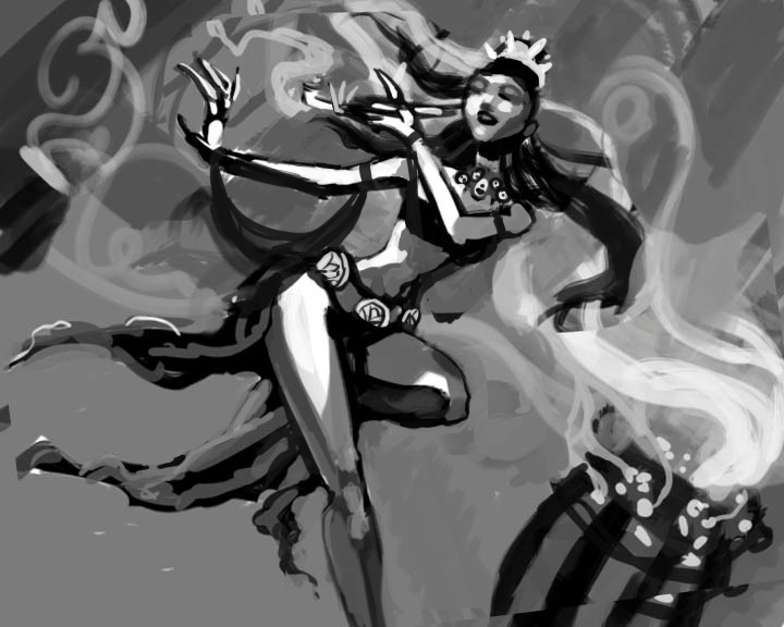 I’m trying something different and working in grayscale to establish tones first. This should, in theory, help me to more efficiently come up with a composition with strong tonal focus that will be effective for the card art size. I ended up tweaking the arm from the thumbnail so that it leads the eye through the page more without closing off the figure, where I would like to show more costume detail.