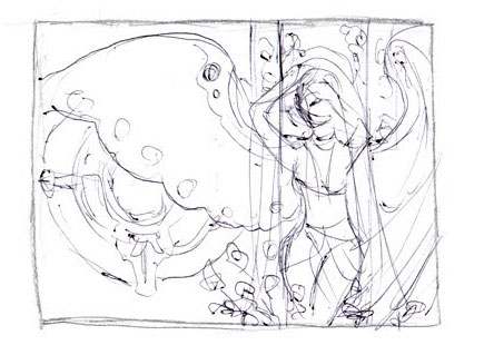 The last thumbnail on the bottom right of the doodle sheet won out for the delightful curve of the dancer’s body through the composition. I took the scan of the thumb into Photoshop, which leads us to…