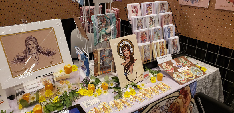 So how’d I do?  I sold half my canvas totes, but only a couple of scarves!  Most folks went for my prints, pouches, totes, and greeting cards (especially the ones themed for the month of September!).  I also think my display made an impression!  People really seemed to love my little ‘shrine’ of flowers and candles.
