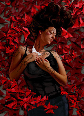 So in the interest of being unique, I lit and photographed my own reference photos, totaling at around 100 I had to sift through for the perfect shot. This involved folding 47 red origami butterflies as well as roping a family member into helping out or using the self-timer while I got up and down and up and down to line up the camera and then rush back to lay on the ground before the timer went off. The results speak for themselves: