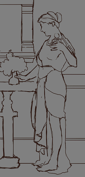 Skin and Light – It’s so easy to just paint in the flat colors, blend them, and call it done with digital, only to discover you’ve made a muddy plasticine mess! This happened to me with the skin, at first, till I realized that by laying the vibrant oranges and pinks down initially, then layering base tones and white highlights on top that I could preserve that glowing luminosity that makes Godward’s works shine. I feel I should have known this, as a watercolor artist, considering laying in the skin blush is what I usually did first. Digital painting shares a lot more with traditional painting techniques than I had originally thought!